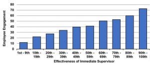 If you work for a poor leader you will be an unengaged employee. The graph below shows results from over 11,000 work groups within the same organization. Employees rated both the effectiveness of their immediate manager and their level of engagement. As you can see, the group with the poorest rated managers coincided with very low levels of engagement. For every increase in the manager’s effectiveness, we could measure an increase in the level of engagement.